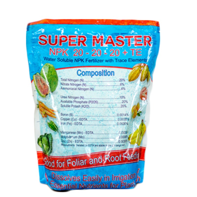 SUPERMASTER 20-20-20 General Purpose fertilizer is an excellent drip or foliar formula for warm weather feeding of a wide range of crops. It has an excellent micronutrient package and is great for a wide variety of water soluble applications. Micronutrients chelated by EDTA are stable in the pH range 4-9